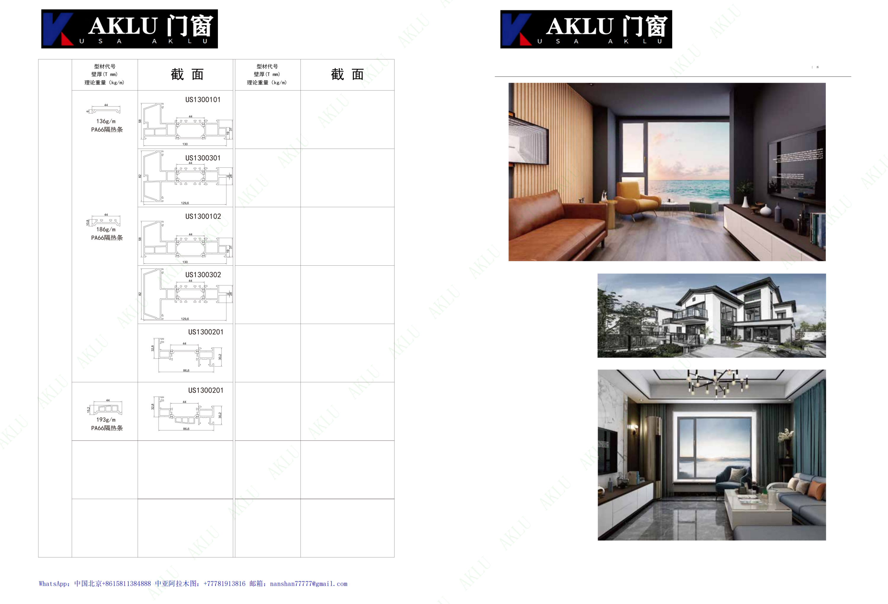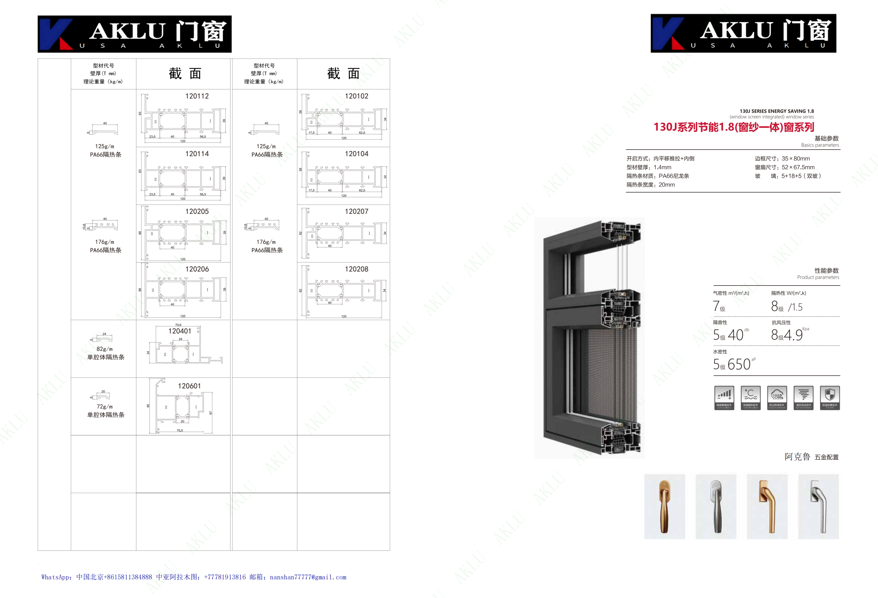 Серия AKLU130 — это энергосберегающее окно со встроенной стальной сеткой, имеющее плоскую конструкцию внутри и снаружи для улучшения визуальной эстетики. Используется процесс инжекции клея с помощью штифта, а соединение центральной опоры использует процесс инжекции клея с помощью соединителя для улучшения водонепроницаемости, герметичности, теплоизоляции и звукоизоляции. Конструкция невидимого желоба позволяет улучшить обтекаемый вид окна; Дополнительно можно заказать декорирование световой полосой. Невидимые сливные канавки также являются опцией, а дренажная система в полу стандартно оснащена: пылезащитными полосами, стальными листами и противопросадочными блоками.